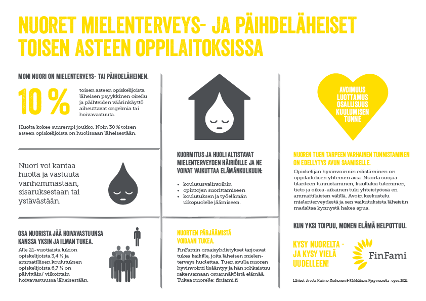 Tältä sivulta löydät tietoa ja työkaluja nuorten kanssa työskentelyyn. Nuorten hoivaajien tunnistamista ja tukemista helpottavat tunnusmerkistö ja huolikortit on kehitetty yhteistyössä Joensuun seudun omaishoitajat ry:n Alisa-projektin kanssa vuosina 2019-2021. Työkalut on kehitetty yhdessä Varsinais-Suomen ja Pohjois-Karjalan alueen koulujen ja sosiaali- ja terveydenhuollon ammattilaisten kanssa sekä hankkeiden toiminnassa olleiden nuorten hoivaajien ja entisten nuorten hoivaajien kokemusten pohjalta. Täältä löydät myös mm. Kysy nuorelta -oppaan, joka kokoaa hankkeessa kerättyä tietoa ja välineitä. Sivun lopusta löydät hankkeelle tehtyjä opinnäytetöitä ja muita hyödyllisiä linkkejä!